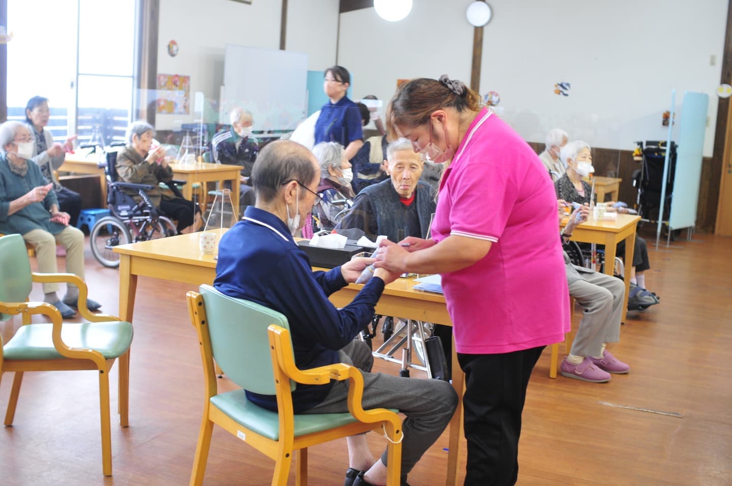 隣接するデイサービスにて機能訓練や入浴またはレクリエーションと、日中を楽しく有意義に過ごしていただけます。ホームヘルプサービスも必要に応じて利用することで日常生活を安心して過ごしていただけます。